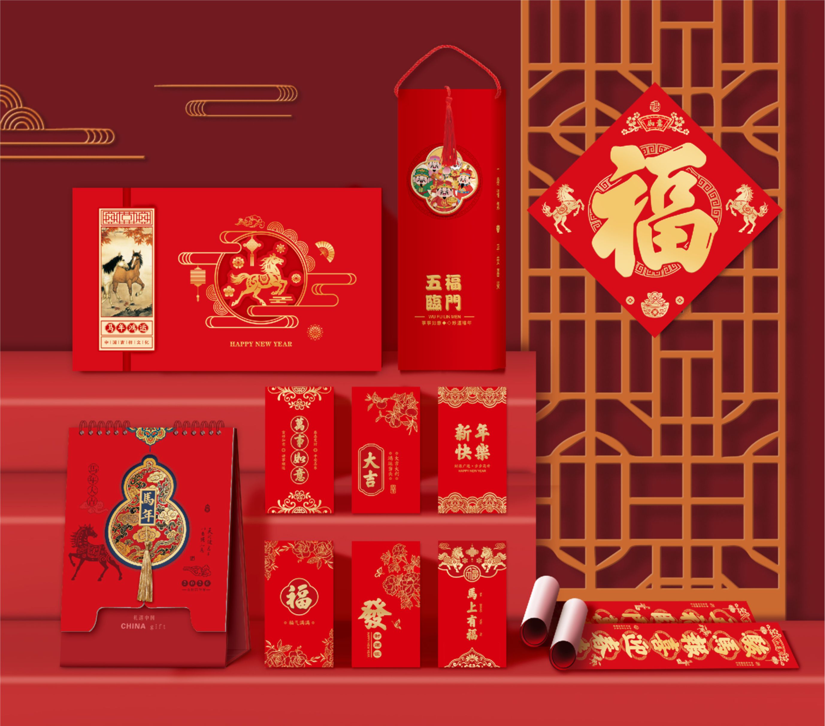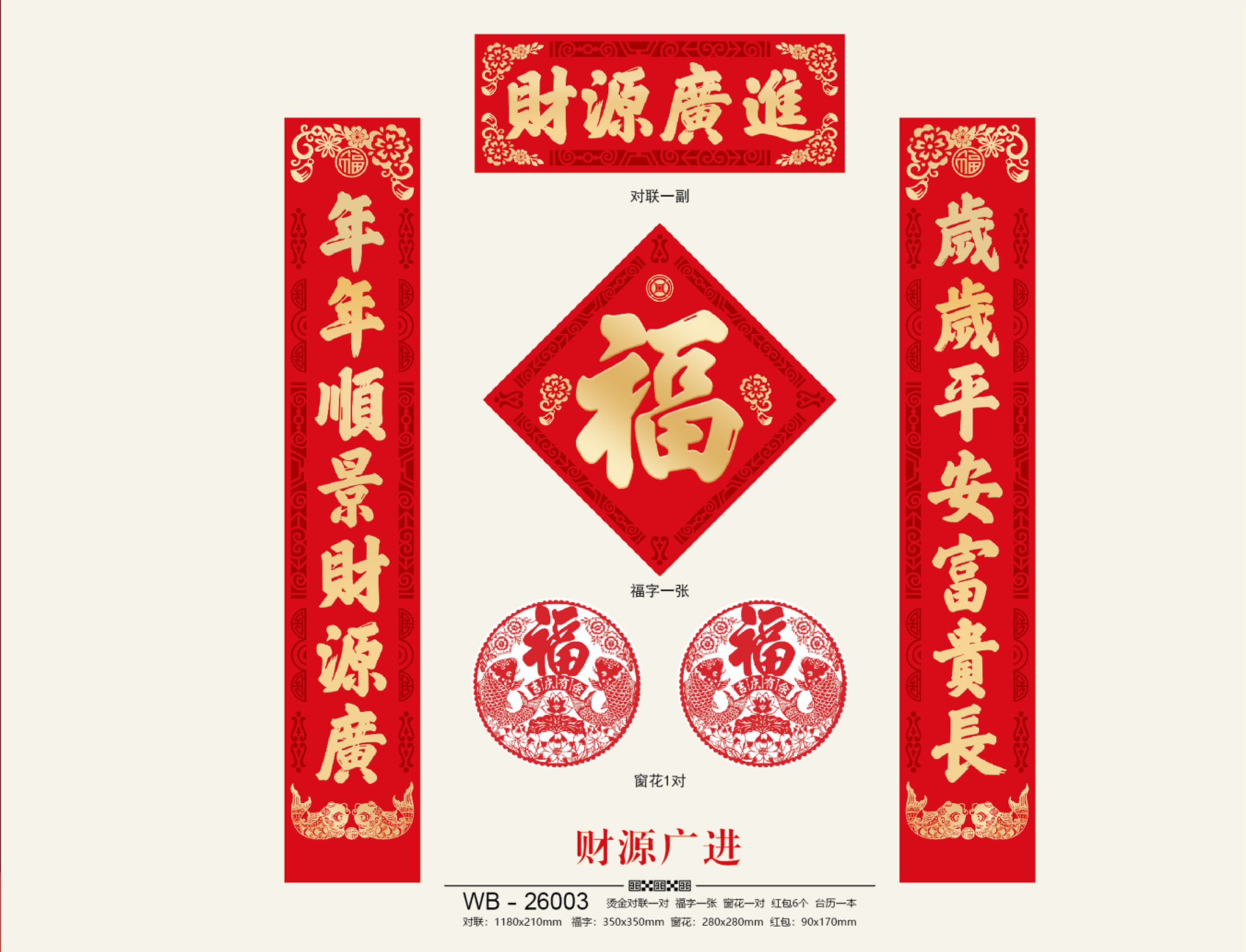 燙金對聯(lián)一對,福字一張,窗花一對,紅包6個,臺歷一本 對聯(lián):1180×210mm 福字:350×350mm