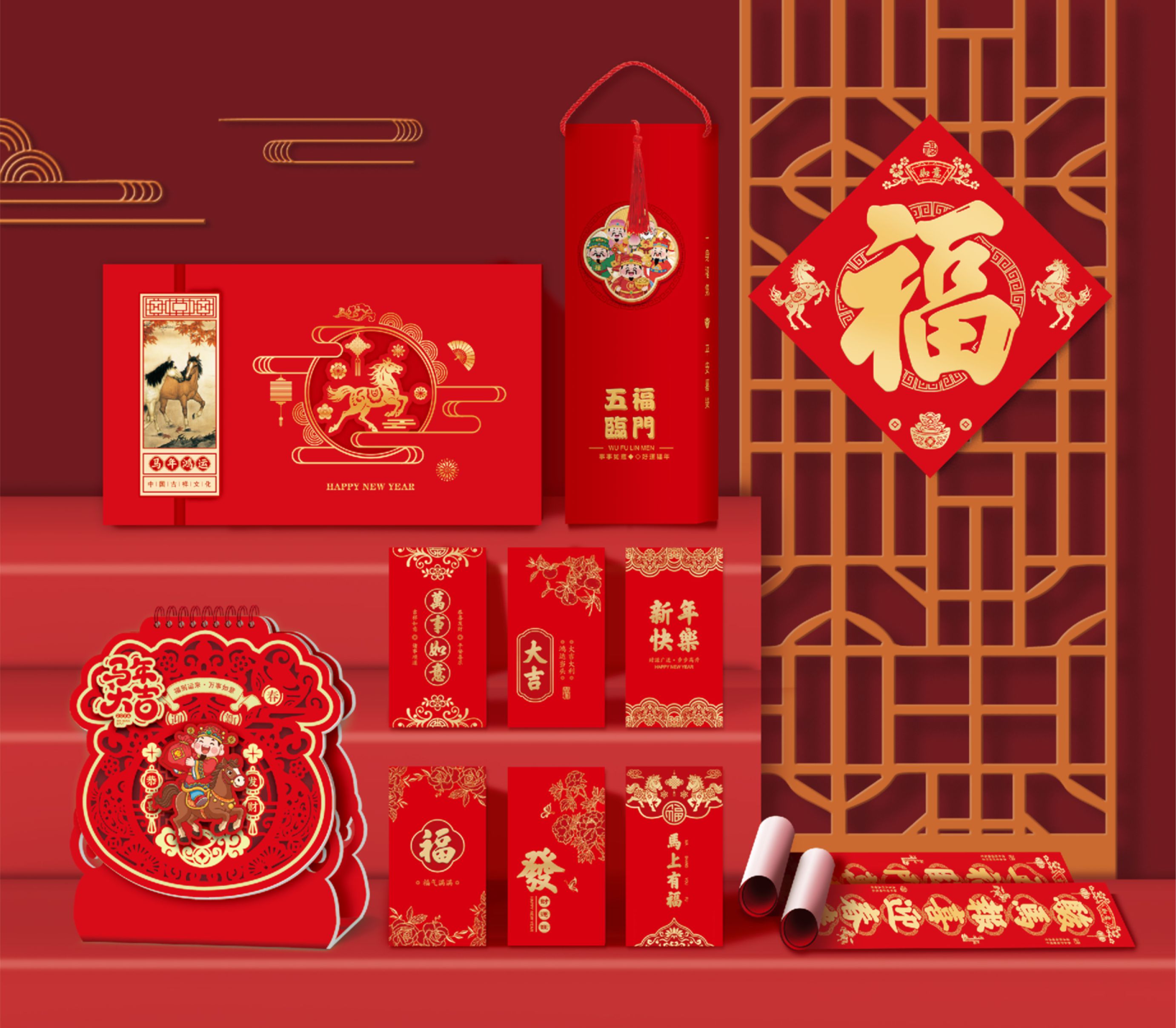 燙金對聯(lián)一對,福字一張,窗花一對,紅包6個,臺歷一本 對聯(lián):1180x210mm