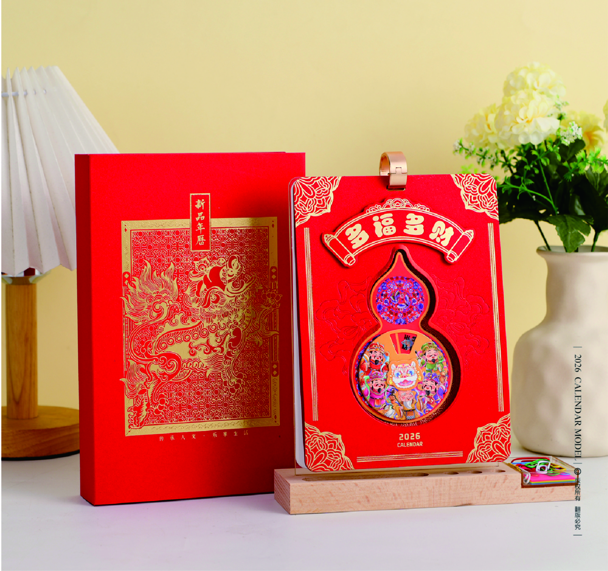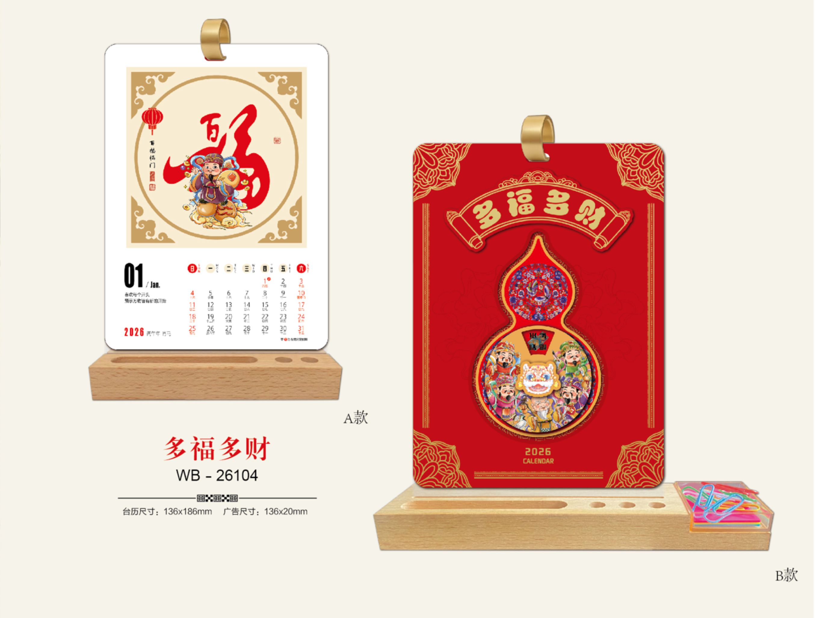十三張多功能特種精雕木座臺(tái)歷-B款-多福多財(cái)