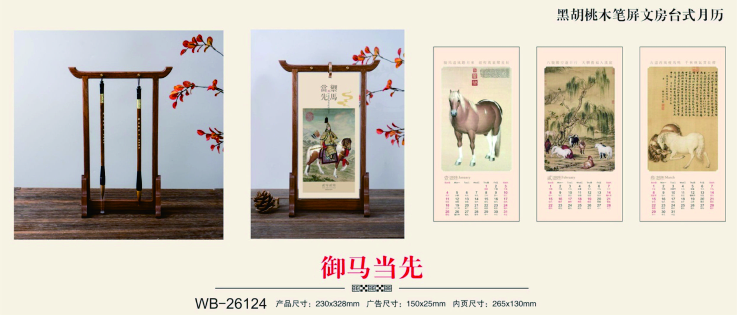 黑胡桃木筆屏文房臺(tái)式月歷-御馬當(dāng)先