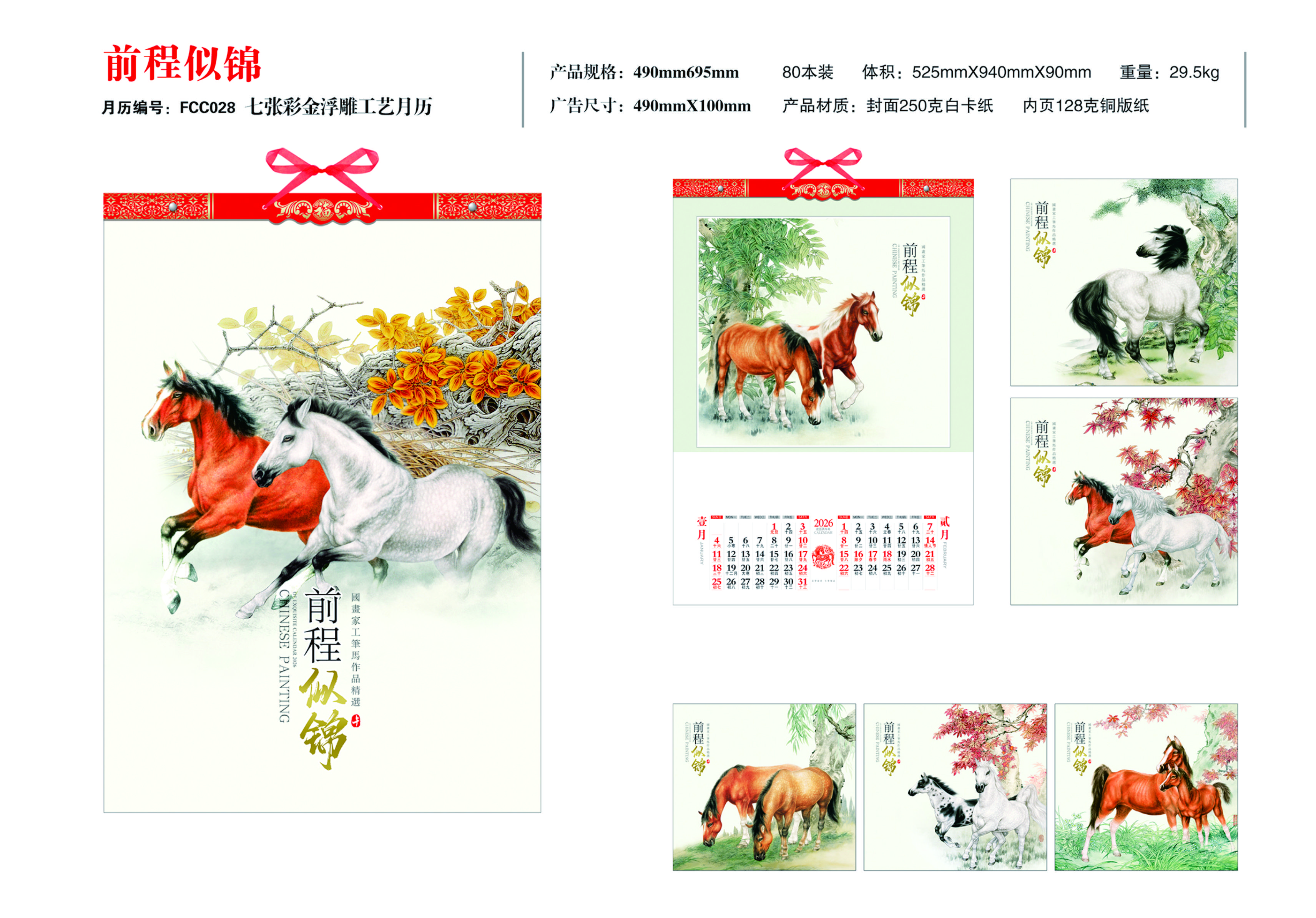 七張彩金浮雕工藝月歷-前程似錦