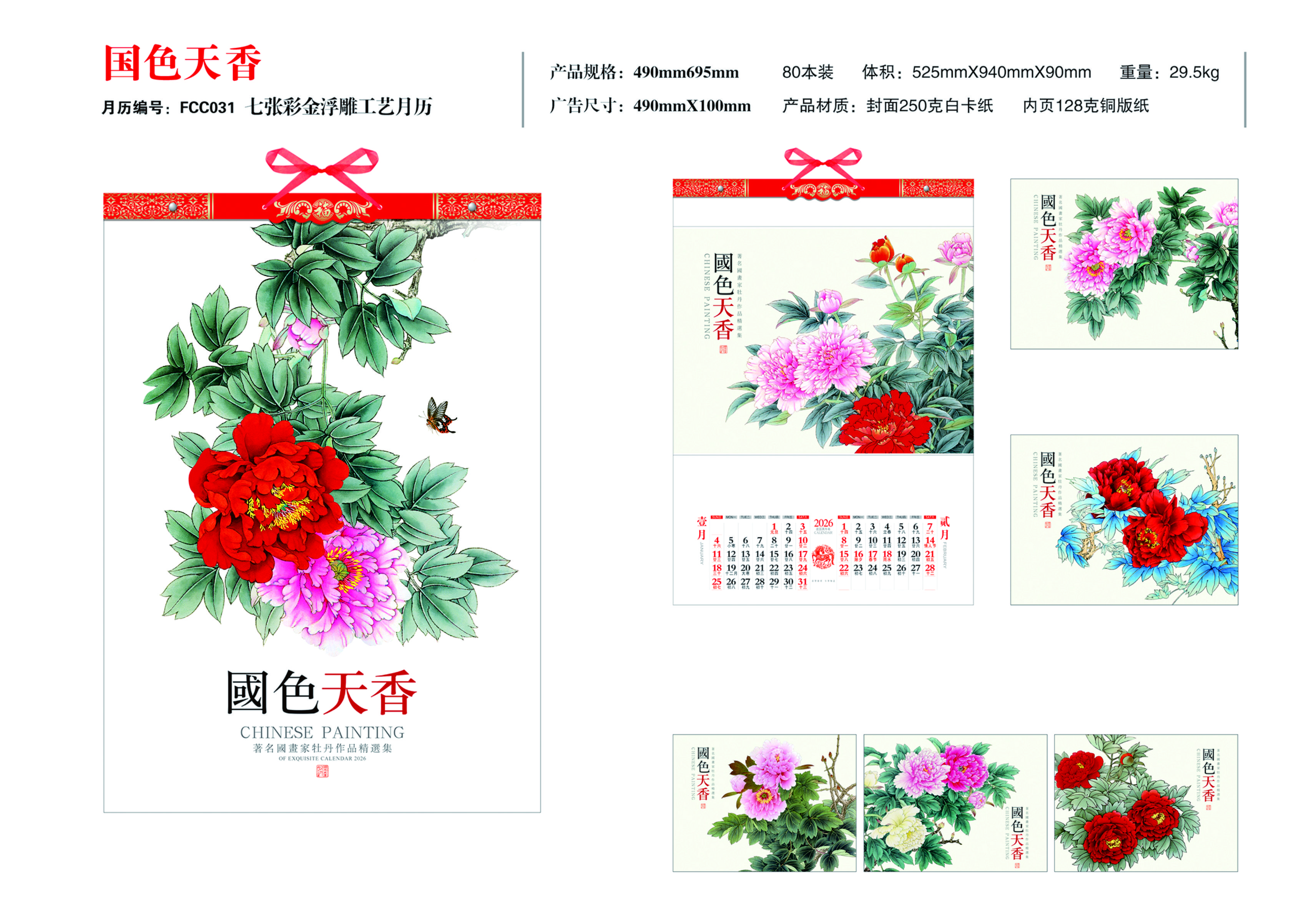 七張彩金浮雕工藝月歷-國色天香