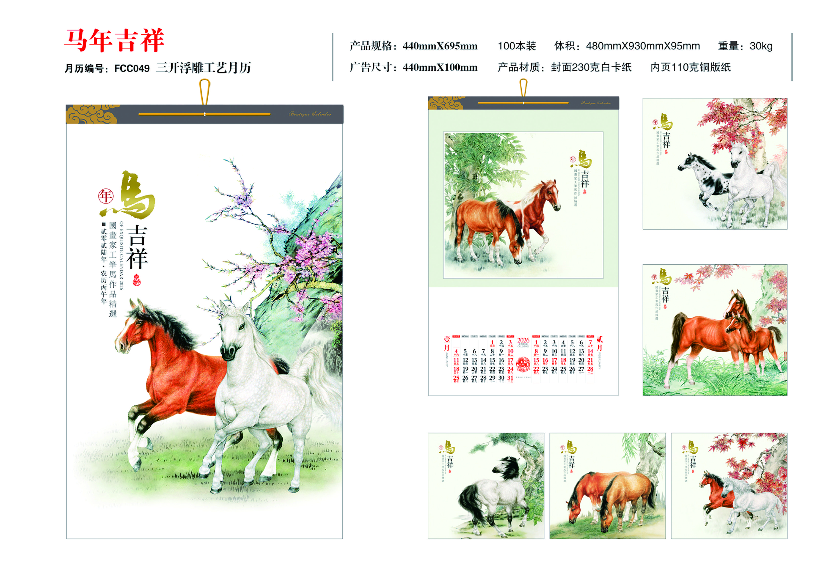 三開浮雕布紋工藝月歷-馬年吉祥