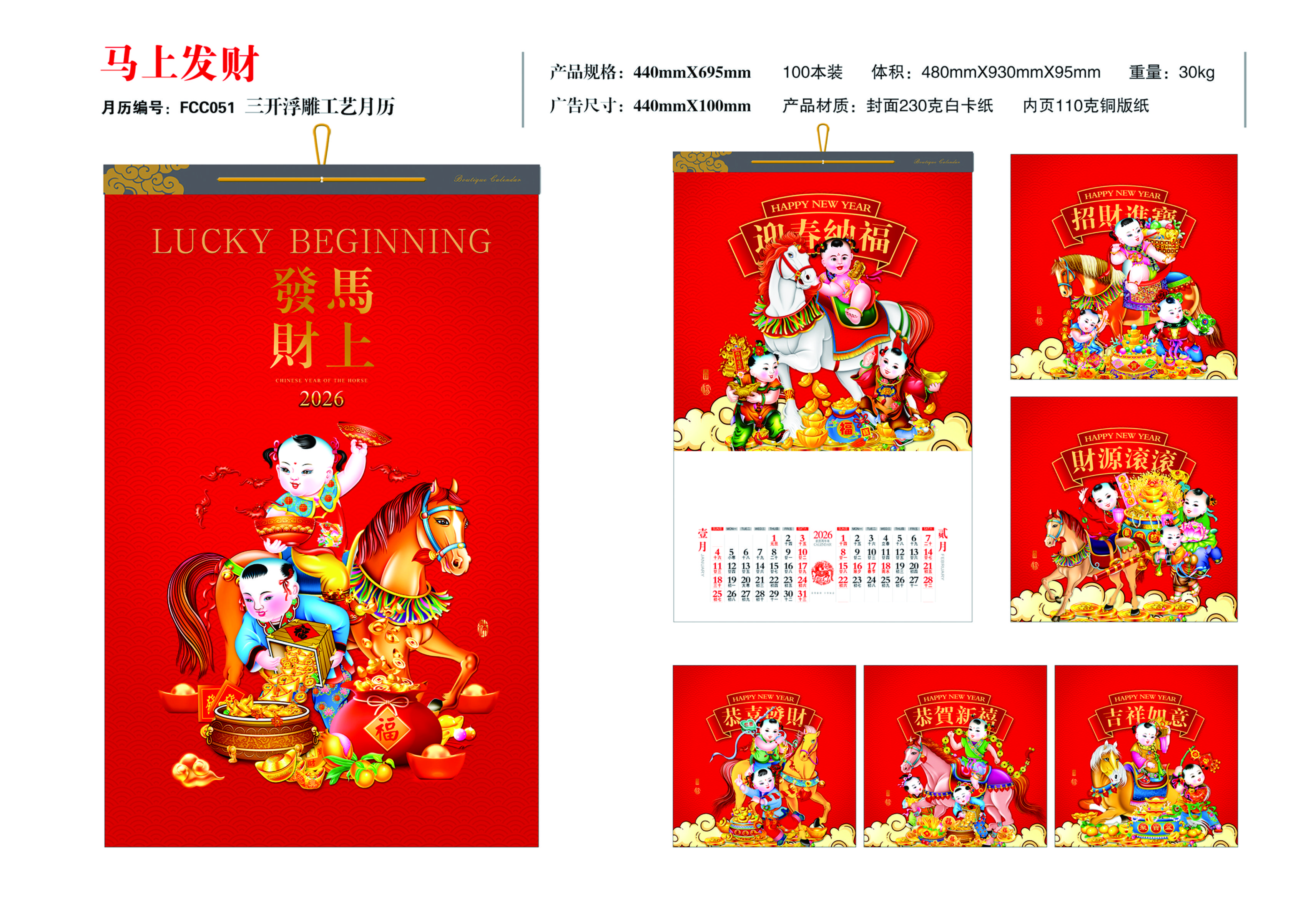 三開浮雕布紋工藝月歷-馬上發(fā)財(cái)