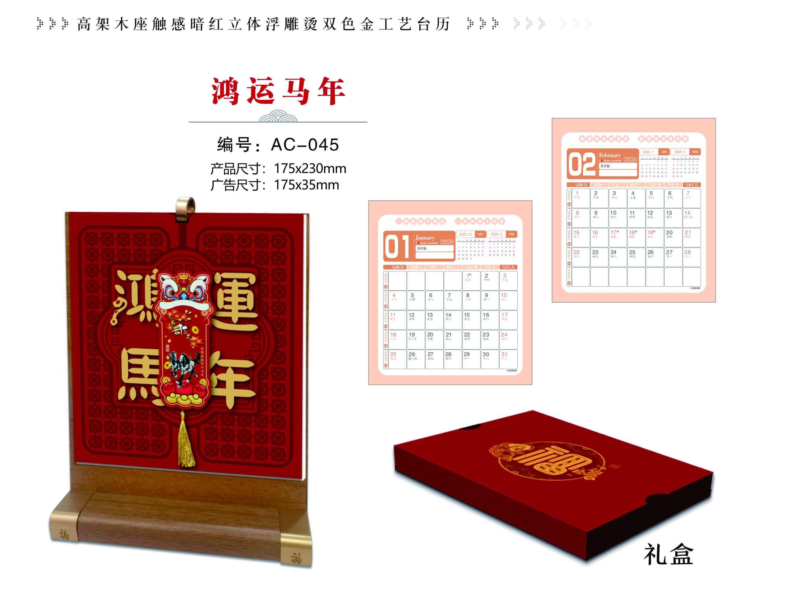 高架木座觸感暗紅立體浮雕燙雙色金工藝臺歷-鴻運馬年