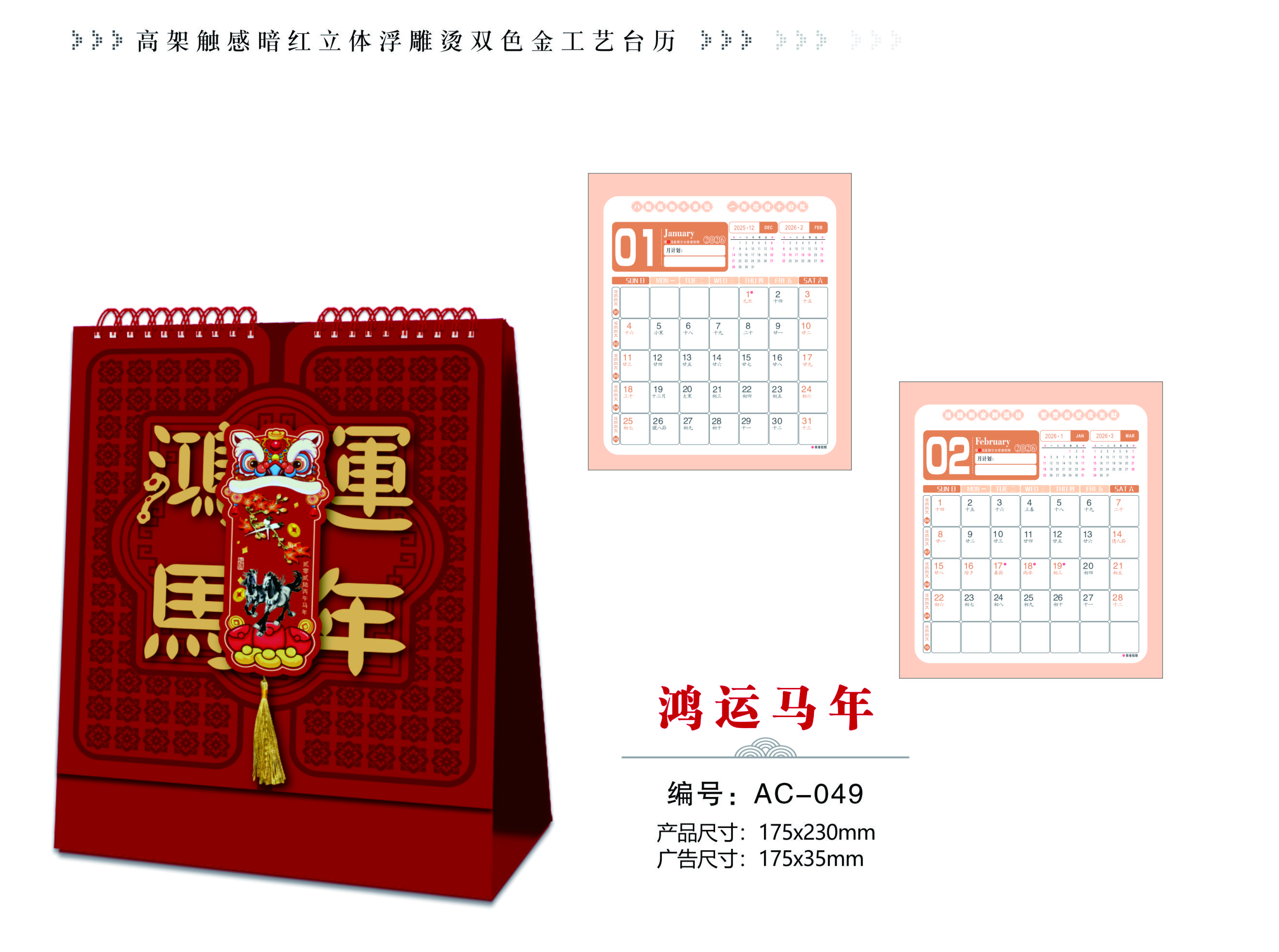 高架觸感暗紅立體浮雕燙雙色金工藝臺(tái)歷-鴻運(yùn)馬年